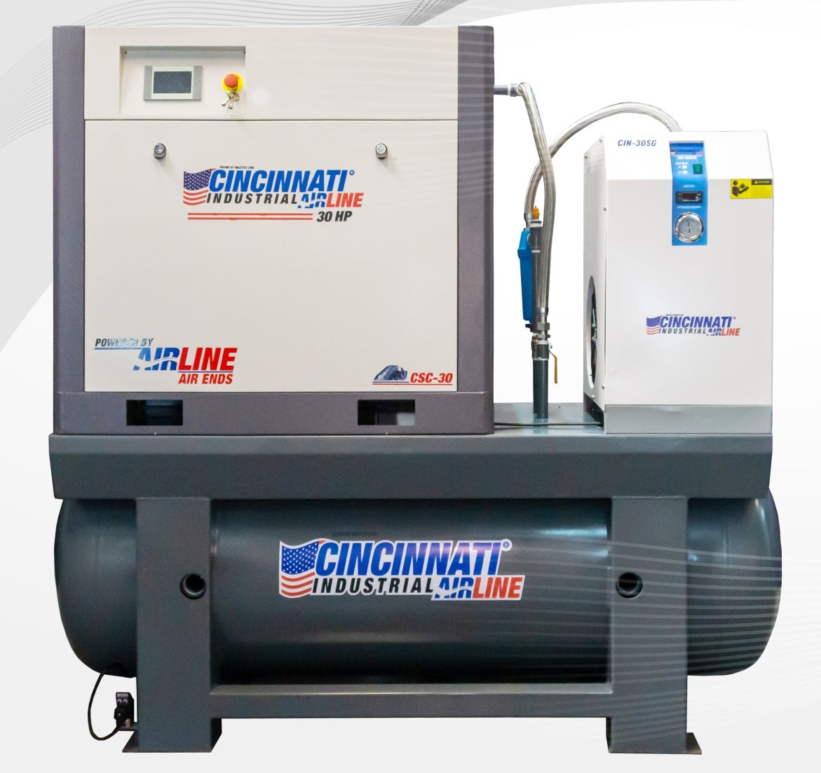 Compresor de Tornillo de la marca CINCINNATI de 30 Hp, a 60 Hz, produce 127 CFM, a una presión normal de trabajo de 116 PSI.
